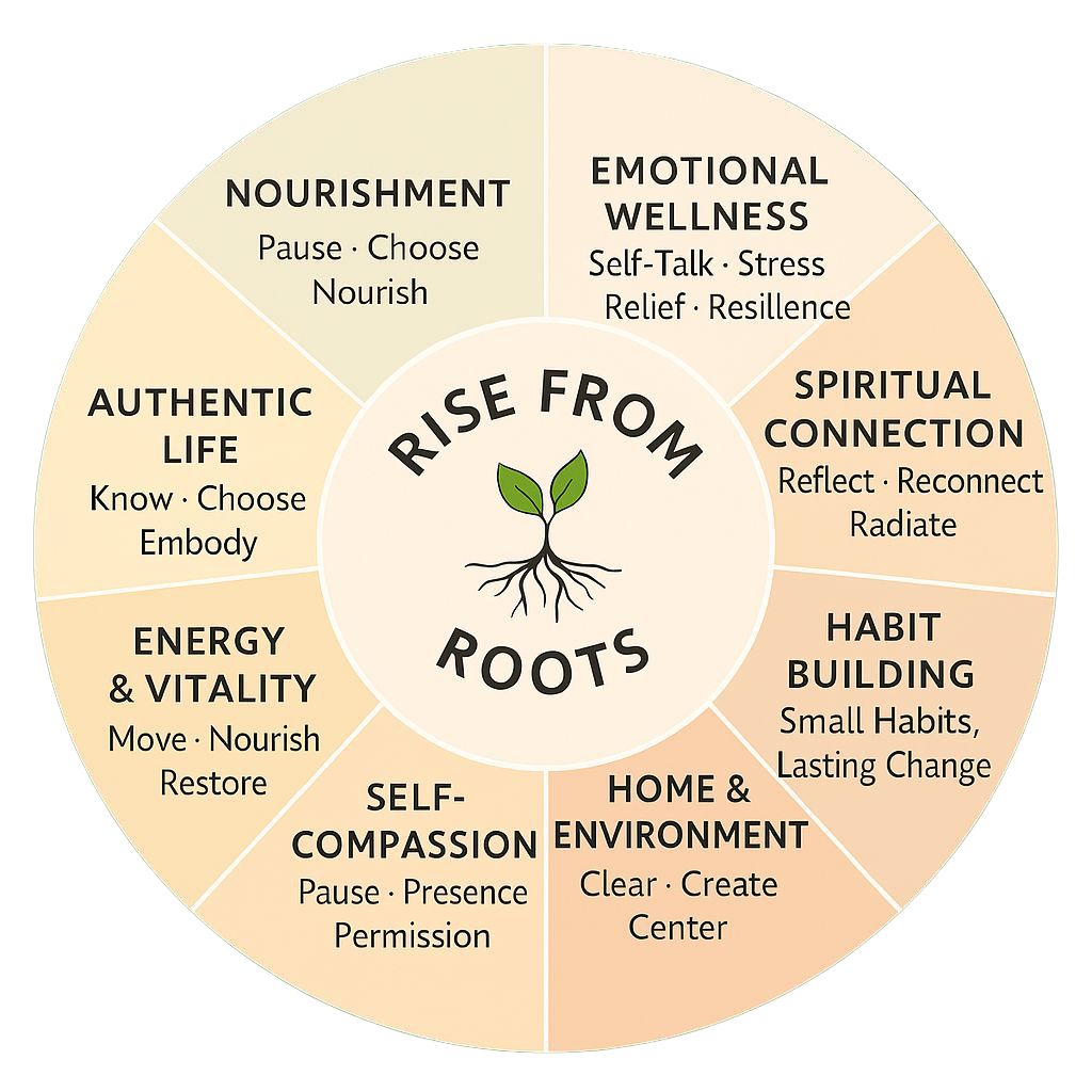 The Rise from Roots Wellness Wheel is built on eight core pillars that nurture every part of you… body, mind, spirit, and environment.